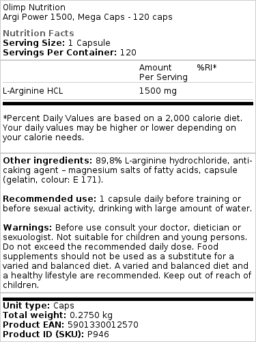 Argi Power Mega Caps/Mega Capsules funciona muito bem como um suplemento independente, assim como uma valiosa adição às pilhas de creatina da OLIMP: Creatine Xplode, Creatine Strong Matrix 7, creatina e suas formas avançadas por OLIMP: CREATINE MAGNA POWER, TCM Mega Caps/Mega Capsules, KRE-ALKALYN 2500 Mega Caps/Mega Capsules, CREATINE MONOHYDRATE 1250 Mega Caps/Mega Capsules, CREATINE POWDER.