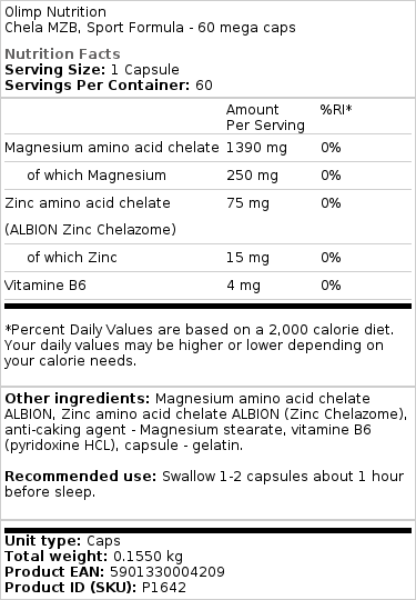 CHELA-MZB SPORT FORMULA é um suplemento alimentar especial baseado em uma combinação única de zinco, magnésio e vitamina B6. As proporções precisas dos ingredientes garantem o correto funcionamento do sistema nervoso, baixando o nível de estresse e prevenindo sua influência negativa sobre o organismo.