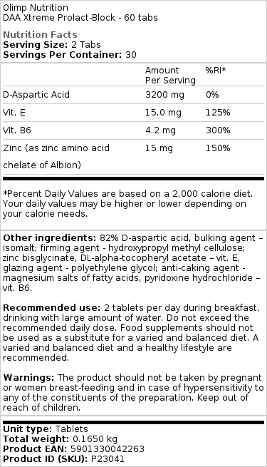 Com total conhecimento de todos os efeitos da dose DAA, pesquisadores do Departamento de Pesquisa e Desenvolvimento da Olimp Sport Nutrition decidiram limitar efetivamente as possíveis conseqüências de uma elevada secreção de prolactina indesejável. A simplicidade, bem como a segurança e a engenhosidade da solução reside no fato de que compostos simples, isto é, vitamina B6, vitamina E e zinco (5, 6, 7) foram usados como inibidores desse hormônio nas proporções apropriadas de peso, orientados de perto para pessoas com maior produção interna de Testoa. Dessa maneira, o efeito devastador do prolactina sobre a massa muscular, equilíbrio endócrino, libido e capacidade de exercício foi reduzido ao mínimo, ao mesmo tempo em que o DAA Xtreme PROLACT-BLOCK se tornou um excelente produto para pessoas com uma sensibilidade geneticamente determinada ao prolactina, problemas permanentes com a obtenção de uma figura magra, esculpida e musculosa, muitas vezes desconhecendo as causas factuais de suas falhas na dieta e nos esforços de treinamento.