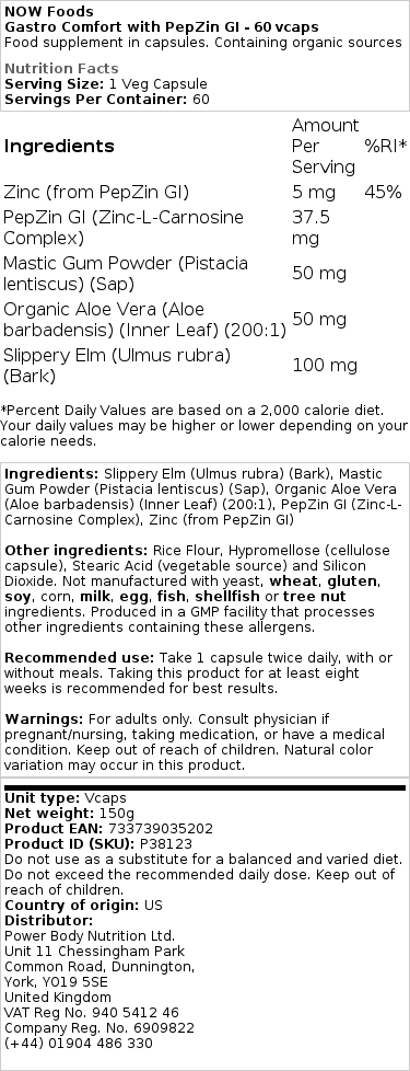 NOW Gastro Comfort é formulado para apoiar um revestimento saudável do estômago. Gastro Comfort apresenta o ingrediente clinicamente testado PepZin GI, que é uma forma patenteada de zinco complexado com carnosina que demonstrou apoiar a integridade do revestimento do estômago, promovendo seus próprios processos naturais de cura. Gastro Comfort também inclui goma de mastique, uma resina da aroeira, que tem sido usada tradicionalmente para manter a saúde gástrica. Além disso, esse produto tem olmo escorregadio e aloe vera para apoiar um sistema digestivo saudável.