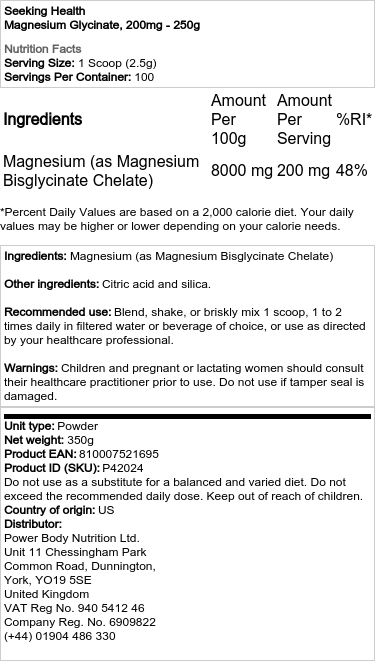 O teor de magnésio é mais alto em leguminosas, nozes, vegetais de folhas verdes e grãos inteiros. Uma deficiência de magnésio nem sempre é devida à baixa ingestão, mas também pode ocorrer com condições médicas e medicamentos que interferem com a capacidade do corpo de absorver o magnésio. Altamente absorvível e geralmente bem tolerada, essa forma quelante de magnésio raramente causa efeitos colaterais gastrointestinais adversos freqüentemente vistos com outras formas de magnésio quando suplementadas em quantidades maiores. Nenhum sabor ou adoçante é adicionado.*