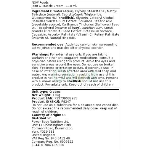 NOW Solutions Joint & Muscle Cream é formulado para uso na pele ao redor das articulações e músculos ativos. Esse produto contém Glucosamina, um composto normalmente encontrado na cartilagem articular das articulações, assim como Boswellia, Capsacin, e Salicilato de Metila natural. Esses três ingredientes ativos são combinados por suas propriedades de cuidado com a pele e para condicionar as áreas ao redor das articulações e músculos. É um ingrediente indispensável para os indivíduos ativos.