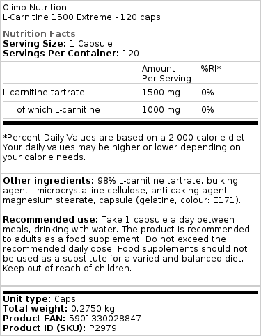 L-CARNITINE 1500 Extreme MEGA CAPS, um suplemento alimentar contendo a dose concentrada da mais pura forma farmacológica de tartarato de L-carnitina de nível ótimo de micronização. Cada cápsula do produto – graças ao uso da tecnologia MEGA CAPS, contém até 1000 mg de L-carnitina pura. Ela garante o curso efetivo das vias metabólicas de produção de energia a partir dos ácidos graxos e, portanto, o desempenho efetivo do processo de redução do tecido gorduroso subcutâneo e controle do peso corporal.