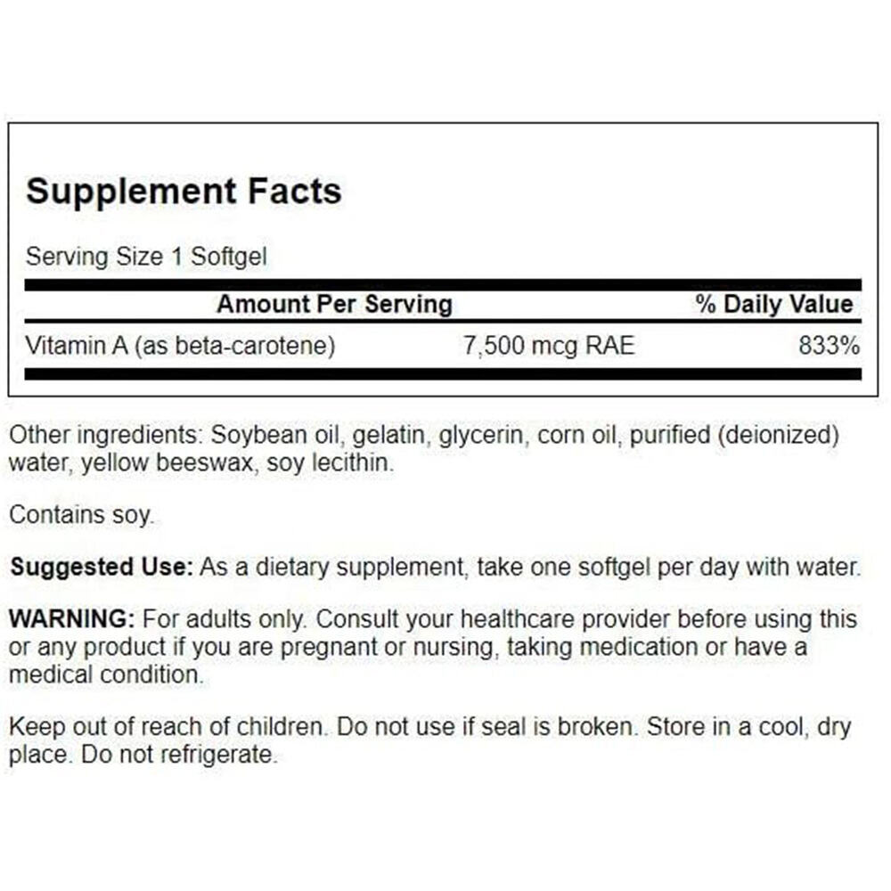 Ingredientes principais: Cada softgel contém Vitamina A na forma de beta-caroteno, além de outros componentes naturais como óleo de soja e lecitina de soja que contribuem para a integridade do produto.