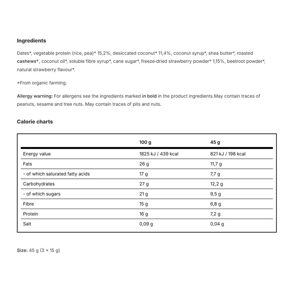 Ingredientes Principais: Enriquecidas com proteína vegetal,estas deliciosas bolas incluem morangos secos e coco ralado,combinando sabores exóticos numa receita simples e pura.